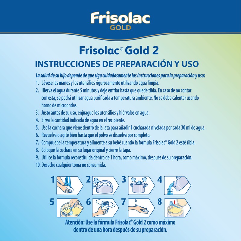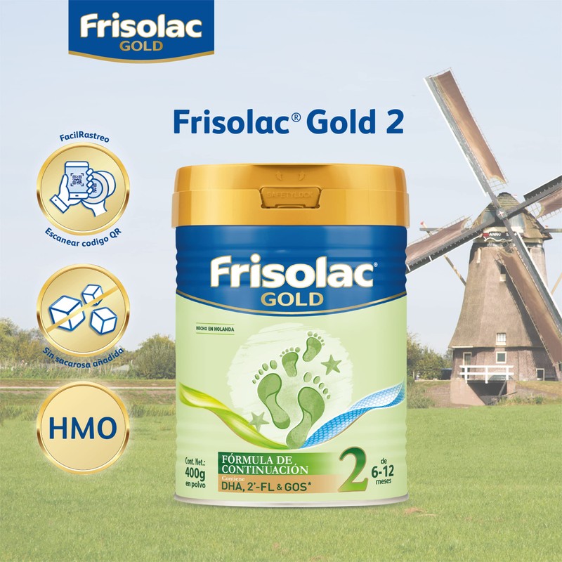 • Frisolac Gold 2 nueva fórmula con HMO 2´-FL (Oligosacáridos de la leche materna. No obtenidos a partir de leche humana. 2´-FL: 2´-Fucosil-Lactosa).