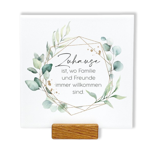 Elegant designThe 15 x 15 cm porcelain stone plate shows a delicate eucalyptus motif with gold-coloured details. In combination with the sturdy oak wood base, it becomes an elegant eye-catcher on a chest of drawers, shelves or windowsills.