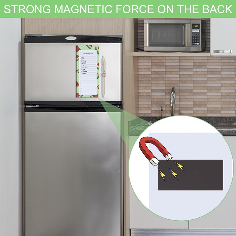 - Design: The magnetic shopping list pad is designed with cute summer watermelon and orange patterns, adding a touch of coolness to the hot summer day. The magnetic pen holder adopts the spring principle design, you only need to insert the pen into the pen holder, and the elastic force of the pen holder will firmly fix the pen