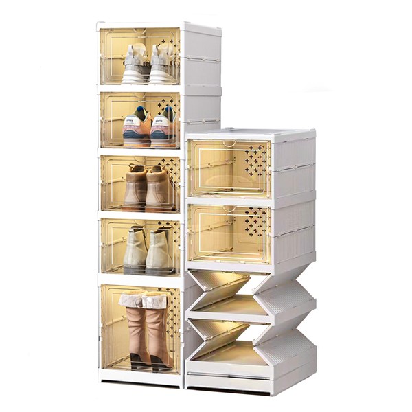 - Foldable Shoe Rack: This shoe box has five layers, four of which are 10.6*13.6*7.4 In, the last layer is a little higher, the size of 10.6*13.6*11.9 In, we make a combination of two different sizes, suitable for a variety of shoes for storage.It can accommodate standard-sized men's and women's shoes, including sneakers, flat shoes, high heels, and more.