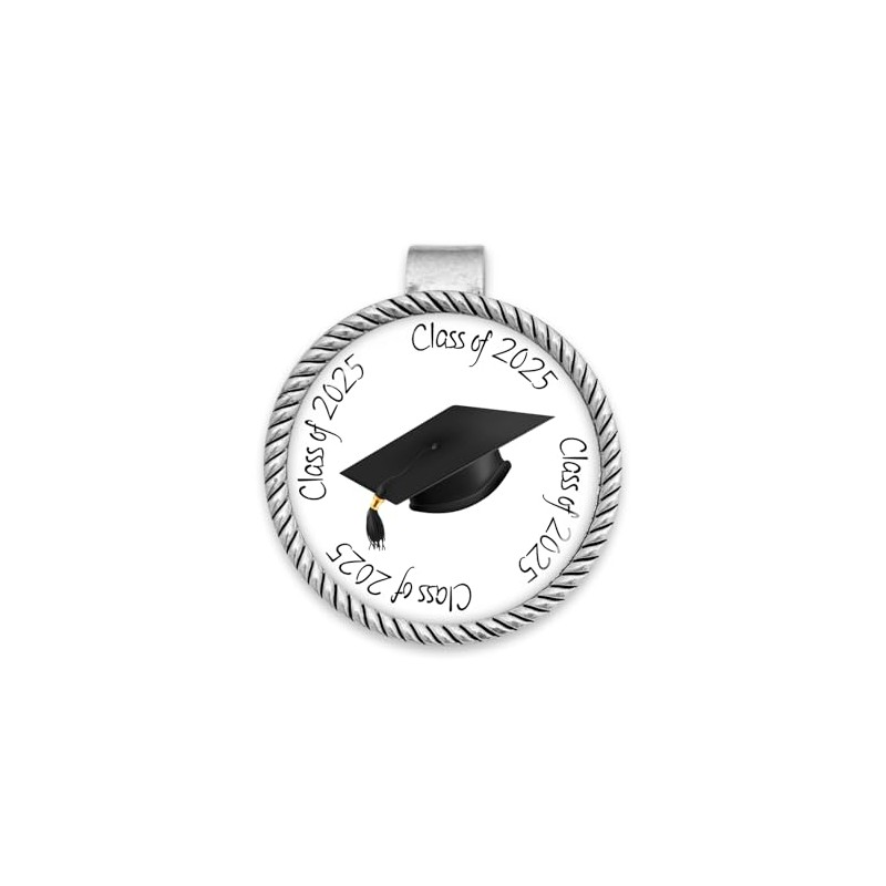 - COMMEMORATIVE DESIGN: Elegant silver-toned circular clip featuring a graduation cap motif and 'Class of 2025' text with decorative rope border trim- Approximately 3" across.