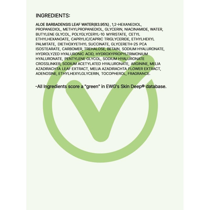 - 83% Aloe Vera Leaf Water: It contains 83% Aloe Vera Leaf Water, which is excellent in soothing skin irritation and helping the skin to recover from damage. Aloe vera is rich in vitamins A, C, and E, amino acids, and minerals, so it deeply nourishes the skin, protects the skin from external irritants, and helps to calm the skin by reducing redness and providing sunburn relief. Even those with sensitive skin can use it with confidence.