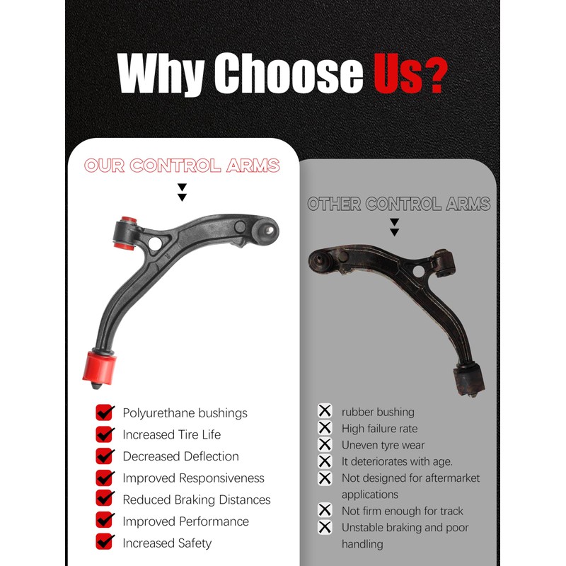 By replacing your worn or damaged control arms, you can restore the precise handling and stability of your vehicle, enhancing your driving experience and safety. Our front suspension control arms kit ensures a perfect fit and easy installation, saving you time and effort.