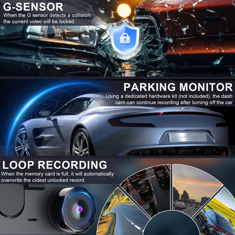 - 24/7 Protection with G-Sensor & Loop Recording: Includes 32GB storage for continuous loop recording – automatically overwrites oldest files when full. G-Sensor locks incident footage during collisions, while 24H parking monitoring* (*hardwire kit required) uses time-lapse mode to conserve storage.