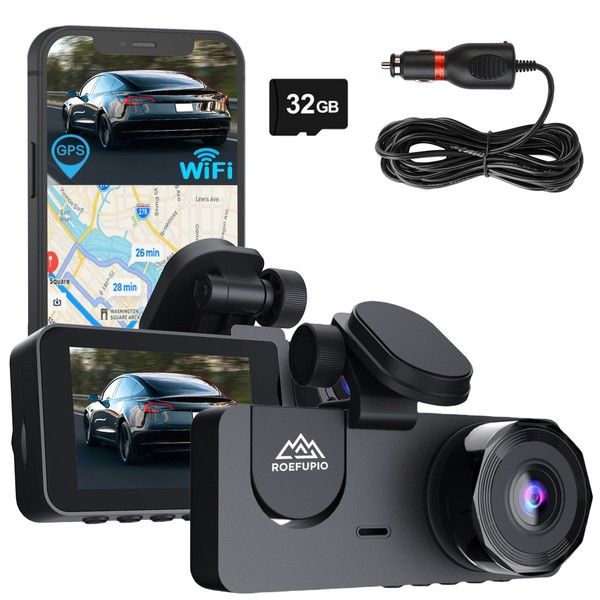 Front and Rear Dash Cam with Full HD 1080P Dual Recording, with 32GB Card, Built-in WiFi GPS, 2” IPS Screen, Night Vision, 170° Wide Angle & 24H Parking Mode.