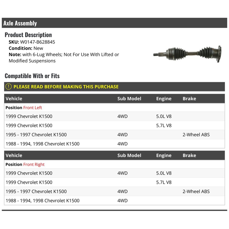 • Compatible with or fits: (Position: Front Right) 1999 Chevy K1500 4WD 5.0L V8 | (Position: Front Right) 1999 Chevy K1500 5.7L V8