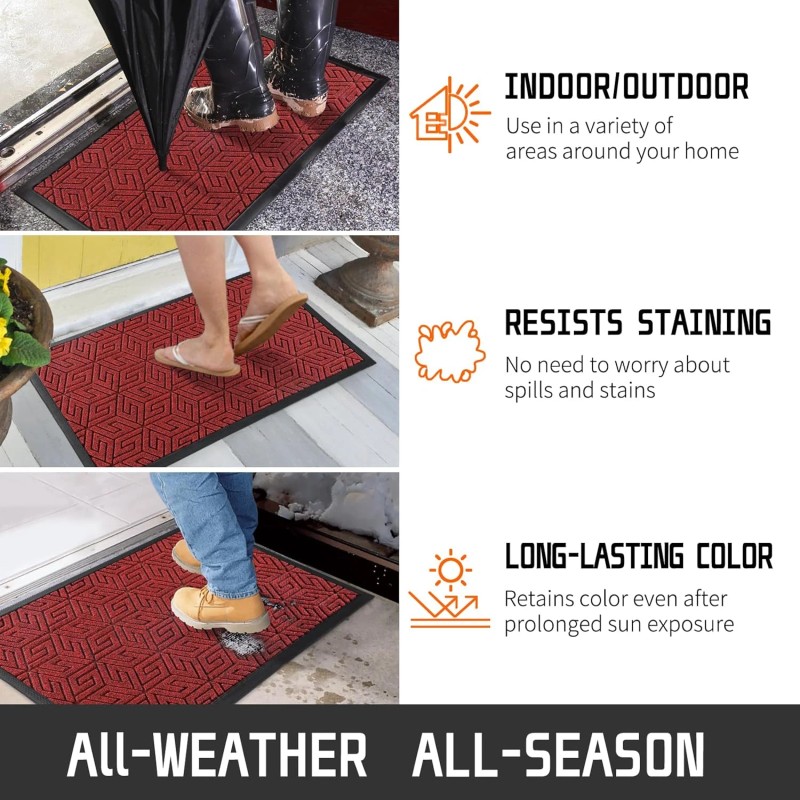- 【Stain, Weather and Fade Resistant】The Yimobra welcome mat is constructed to withstand all weather conditions, from snow and rain to mud and sand. It features a stain, weather, and fade-resistant topside, ensuring long-lasting use both inside and outside your home. It's sturdy doormat surface is made of polyester material with good water proof, can capture rain, snow, and dirt