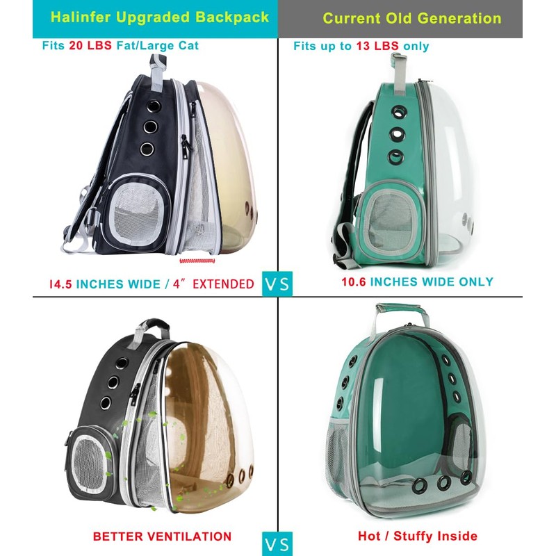 - Are you still using the SMALL cat bubble backpack while your little kitten grows up. Your furry friend deserves to own a bigger one. That's the exact intention we launch this front expandable cat backpack, 4" extension in front means bigger and roomy inside, fits up to 20 pounds large fat cat.