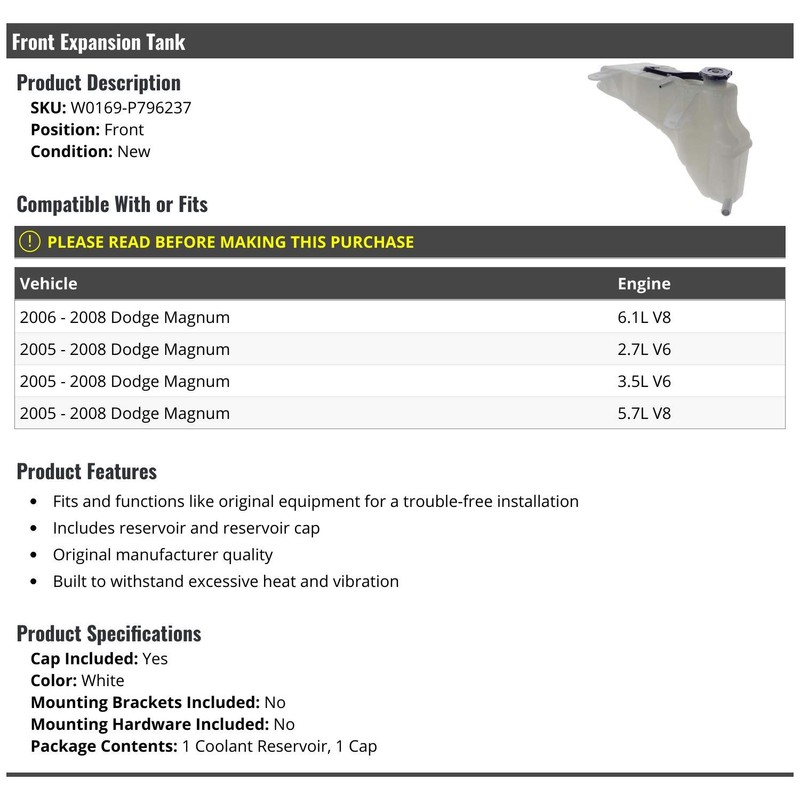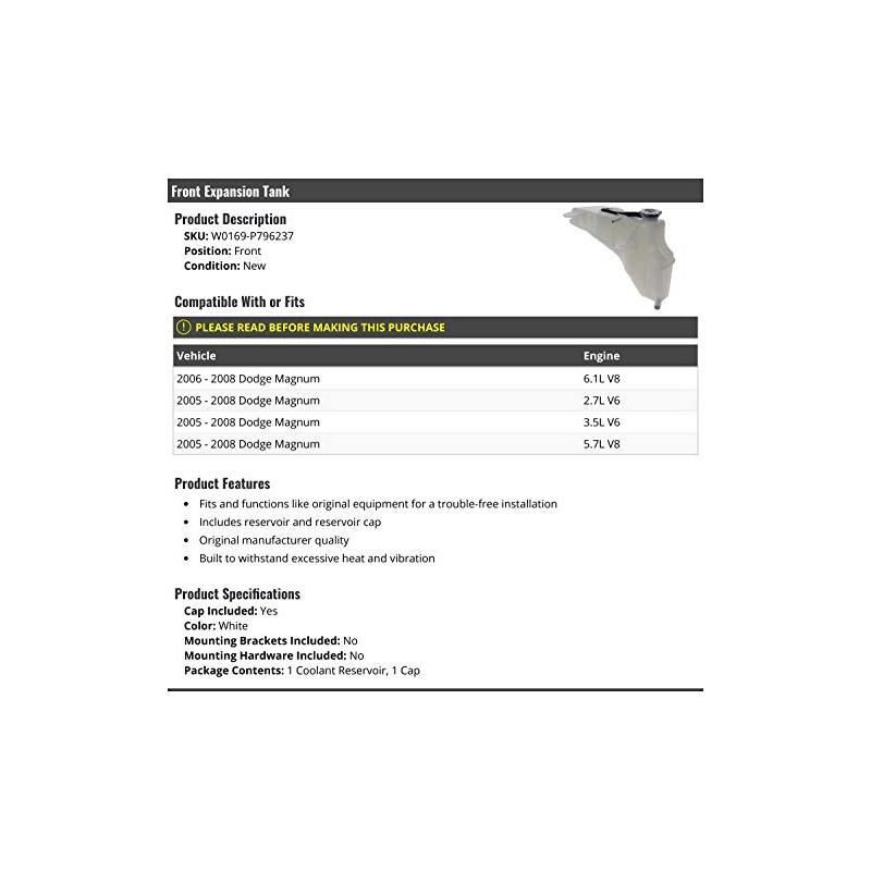 - Compatible with or fits: 2006 - 2008 Dodge Magnum 6.1L V8 | 2005 - 2008 Dodge Magnum 2.7L V6 | 2005 - 2008 Dodge Magnum 3.5L V6 | 2005 - 2008 Dodge Magnum 5.7L V8