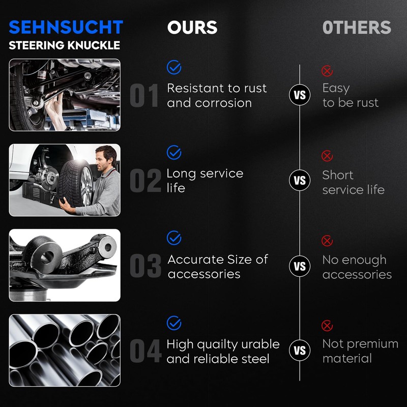 - Premium Material: This steering knuckle assembly are made of durable and reliable steel. And this kit is painted with a special coating, not only make it Resistant to rust and corrosion,but also make it effectively extend the service life time.