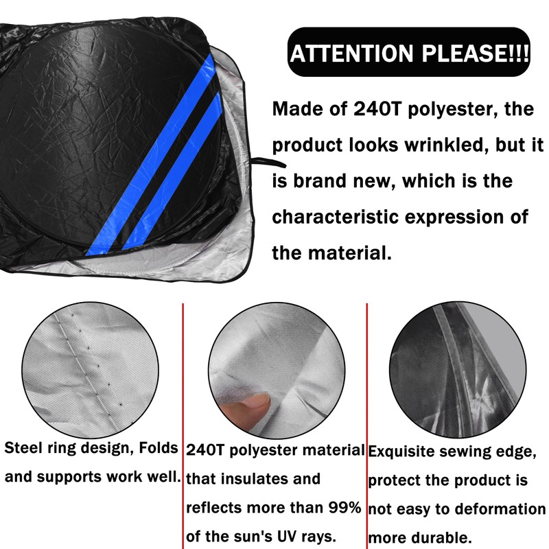 - ➤Material: Made of high quality 240T titanium silver glue coated with composite polyester, tough and thick, stronger than ordinary 210T heat insulation effect, better UV blocking effect. Black tape on the back sunscreen design, completely block the light. The product is sewn with double heat insulation cloth, which is more durable.
