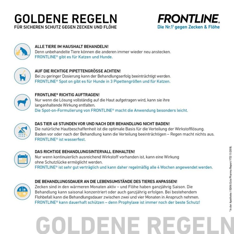 ProduktbeschreibungenWICHTIGE HINWEISE (PFLICHTANGABEN):FRONTLINE SPOT ON HUND S 67 MG, L?SUNG. Wirkstoff: Fipronil. Anwendungsgebiete: Zur Behandlung von Hunden gegen Floh-, Zecken- und Haarlingsbefall.ZU RISIKEN UND NEBENWIRKUNGEN LESEN SIE DIE PACKUNGSBEILAGE UND FRAGEN SIE IHREN TIERARZT ODER APOTHEKER.Rechtliche HinweiseZu Risiken und Nebenwirkungen fragen Sie Ihren Arzt oder Apotheker.