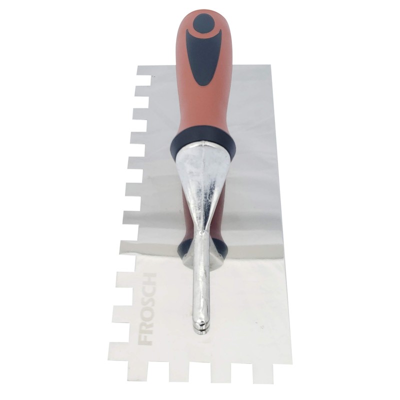 Frosch Stainless Steel Tile Trowel with Comfort Grip features a heavy duty design. Premium quality trowel designed for professional tile installers. 1/2-inch by 1/2-inch square notch trowel.