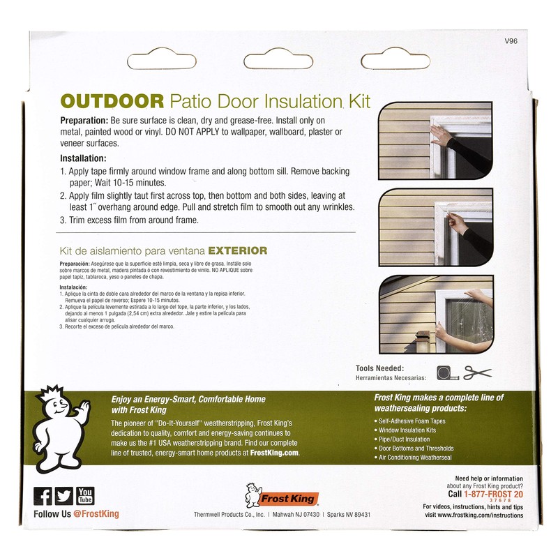 Product DescriptionFrost King V96H Stretch Window Kit 84-Inch by 110-Inch. Made for outdoorsFrom the ManufacturerFrost King Stretch Window Kit for Patio Doors or Picture Windows come with double-face mounting tape that's especially formulated for cold weather application. The plastic can be easily stretched in place tight and wrinkle-free.Manufacturer Contact Information1-800-526-5265