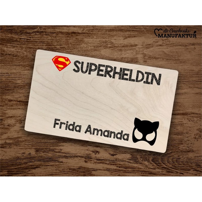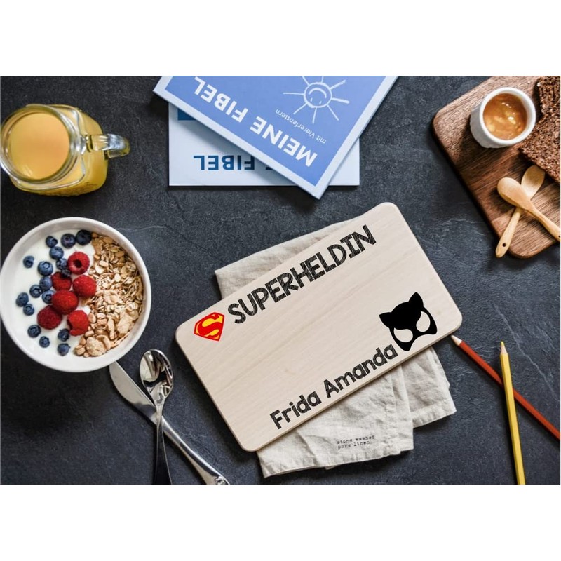 Frühstücksbrettchen für Kinder Superheld-Katzen-Frau, Vesperbrett personalisiert mit Namen, Individuelles Brettchen mit Superhelden aus Holz in Farbe gedruckt, Die Geschenke Manufaktur