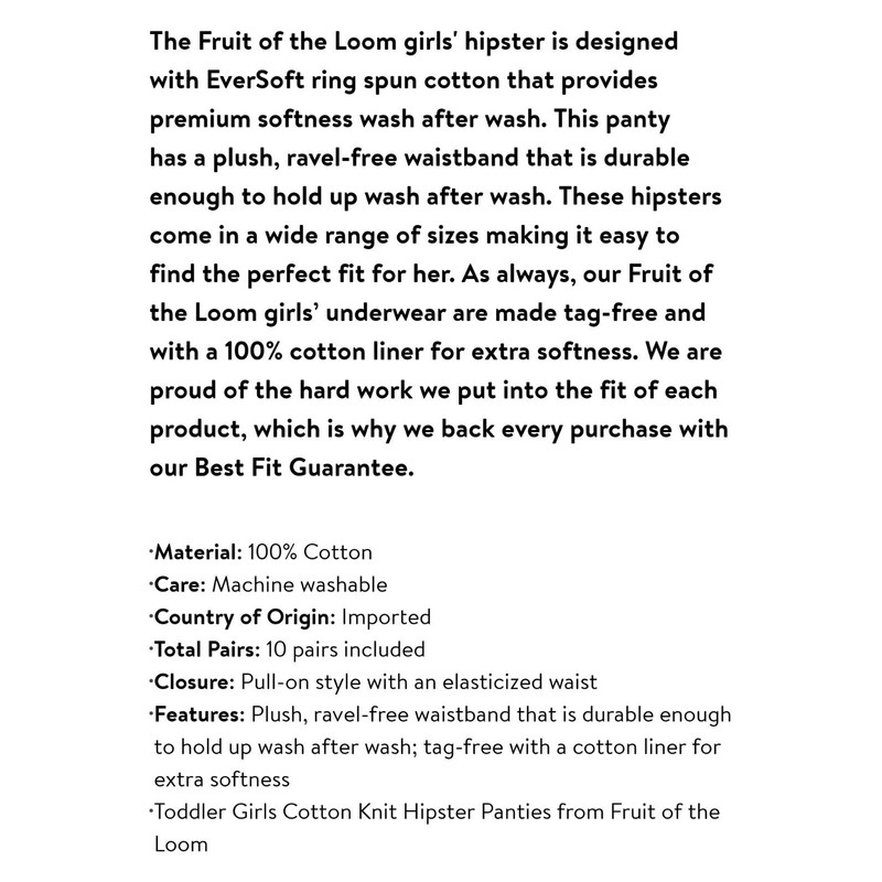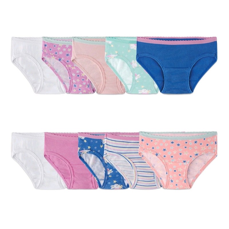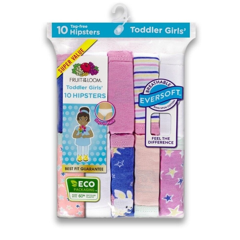Keep your little girl comfortable with this 10 pack of FRUIT OF THE LOOM EVERSOFT HIPSTER UNDERWEAR. Made of 100% cotton, these underwear are lightweight, breathable and tagless. The hipster style provides full coverage and the assorted colors and patterns add variety to her wardrobe. Machine washable for easy care, these underwear are perfect for everyday wear.