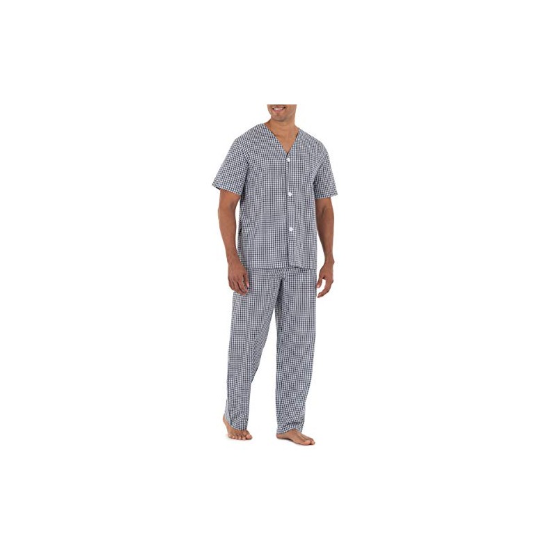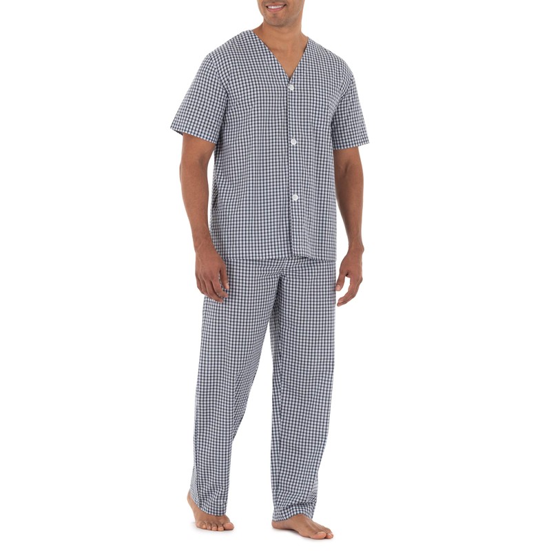 Fruit of the Loom Men's Broadcloth Short Sleeve Top and Long Pants Pajama Set, Navy/White Check, Small