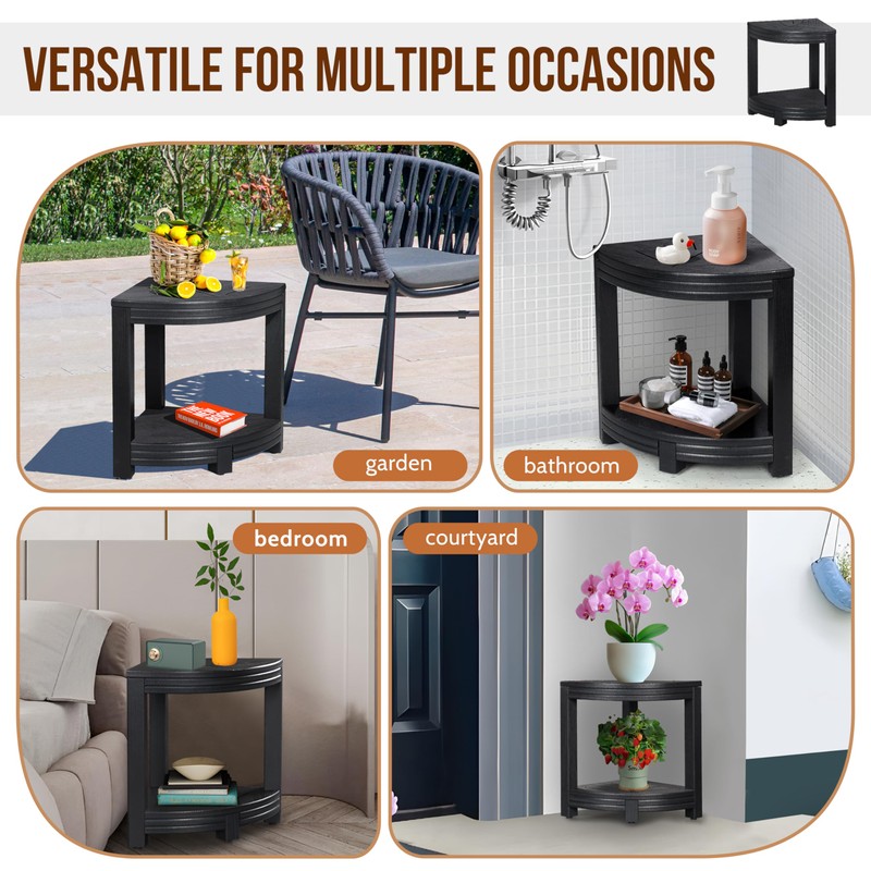Our 2-layer shower stool is made of high-quality HDPE material, offering excellent waterproofing, weather resistance, and easy cleaning. This shower stool for inside shower is perfect for individuals with limited mobility, providing a comfortable seat for washing up. The bottom layer is designed to store toiletries, making it convenient to access and organize your items. It can also be used as a shower stool for shaving legs or as a footrest for pedicures. Featuring a 90° design, the stool fits perfectly in the corner of your bathroom, saving space and ensuring no unnecessary clutter. This versatile corner shower stool can also be used in other settings such as bedrooms or living rooms.
