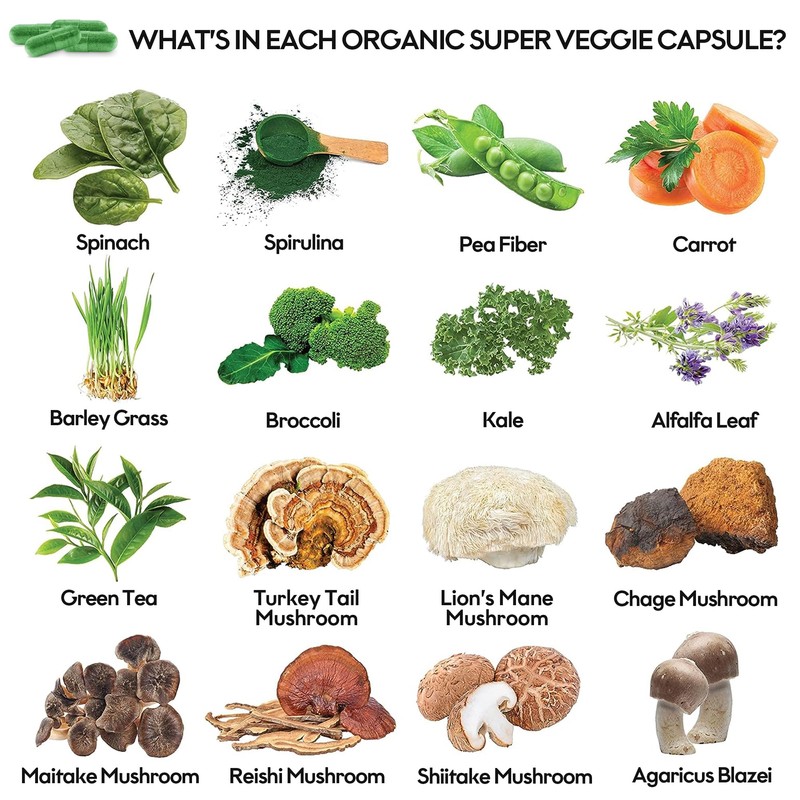 - Essential Blend of 16 whole veggies: #1 Maintenance Blend Broccoli (Whole Plant), Spinach Leaf, Green Cabbage (Head), Wheatgrass Leaf, Kale Leaf,Cauliflower (Whole Plant), Celery Stalk, White Onion Bulb, Zucchini Fruit #2 Protection Blend Garlic Clove, Red Cabbage Head, Red Onion Bulb, Carrot Root, Kale Leaf, Cayenne Pepper (Fruit & Seed), Shiitake Mushroom (Whole), Wheatgrass Leaf, Sweet Potato (Tuber) #3 Healing Blend: Carrot Root, Kale Leaf, Green Onion Scape, Spinach Leaf, Cauliflower (Whole Leaf), Celery Stalk, Zucchini Fruit
