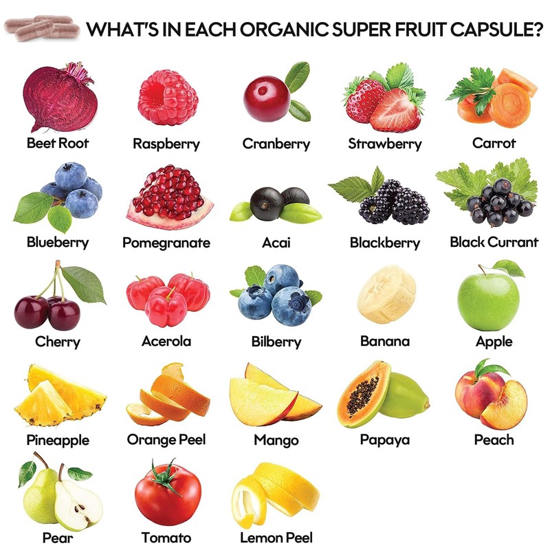 - Wholesome Blend of 23 whole fruits Super Fruits: #1 Maintenance Blend: Tomato, Papaya , Banana, Apple, Grape, Elderberry, Strawberry, Aloe Vera #2 Protection Blend: Orange, Tart Cherry, Cranberry, Wild Blueberry, Grape, Apple, Grapefruit, Aloe Vera #3 Healing Blend: Raspberry, Pineapple, Mango, Sweet Cherry, Lemon,Aloe Vera Balance formulas of Fruits are high in antioxidants to promote heart health, improve brain function, and boost the immune system. supporting digestive health and reducing inflammation.