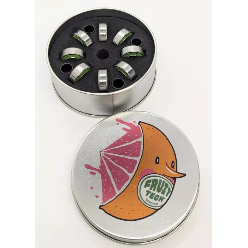 Summer Greens, Fruit Tech 9 Team Bearings. Double-shielded and serviceable like all previous bearings, these are purchased in packs of 8 and they include bearing spacers. Keep the tin for your sundries or reuse it for a little emergency skate repair kit . Whatever you do, we don't judge. Go fast. Have Fun.