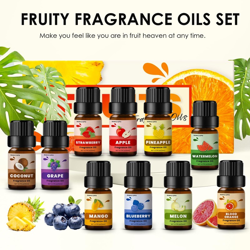 Fruity Fragrance Oil for Candle & Soap Making, INWICOPH Premium Essential Oils 5ml x 10 - Blueberry, Strawberry, Mango, Blood Orange, Essential Oil Diffusers for Home