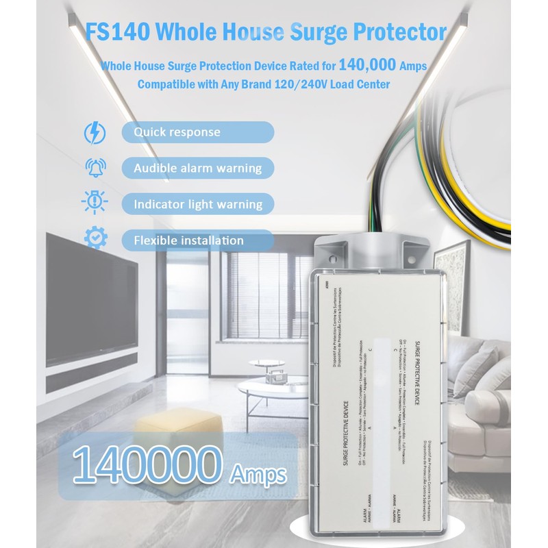 - Whole House Surge Protector: FS140 surge protector protects smart home appliances and electronic devices from power surges. Surge protectors block power surges from entering your home and protect a variety of electronic devices and appliances in your home, including smart home appliances, TVs, computers, heating and cooling systems, etc.
