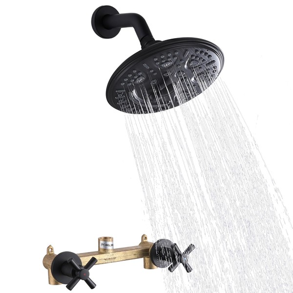 FSCEPIXI 2 Handles Shower with 8'' Rainfall Shower Head,Single Function Shower Trim Kit with Rough-in Valve,Wall Mount,Matte Black