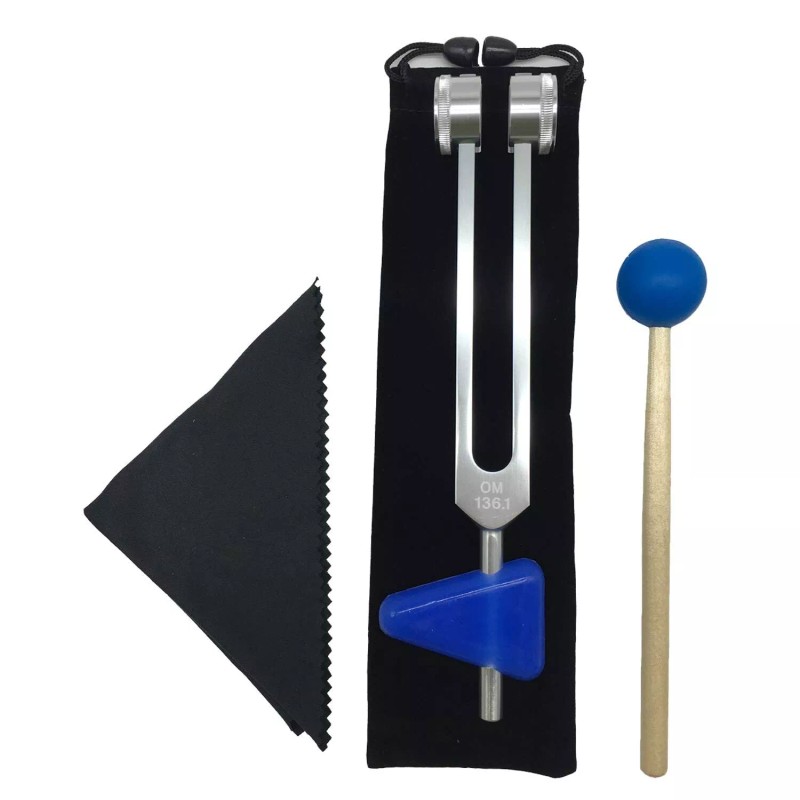- PACKAGE INCLUDES - 1 x OM 136.1 Hz tuning fork, 1 x wooden hammer striker, 1 x triangular silicone, 1 x cleaning cloth, 1 x drawstring storage bag, total of 5 pieces.