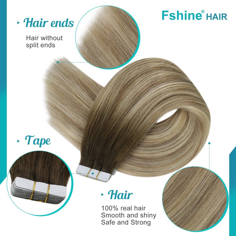 Fshine Tape-In Extensions, Real Hair, Balayage Colour 3 Dark Brown Fading to 8 Ash Brown and 22 Light Blonde, 100 g, 40 cm, Skin Weft Tape in Extensions, 20 Pieces, Remy Tape-in Real Hair Extensions