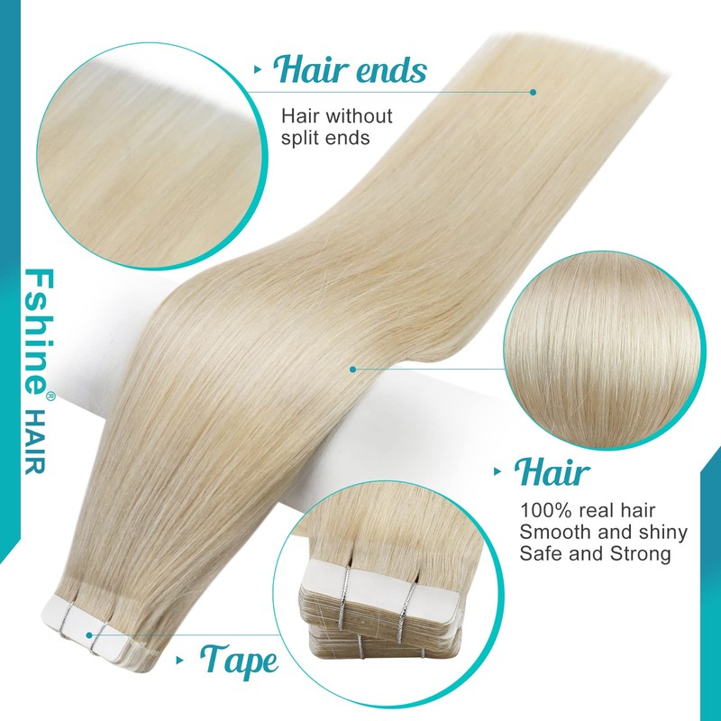 Fshine Tape-In Real Hair Extensions, 60 Platinum Blonde, Tape-In Extensions, Real Hair, 40 cm, Invisible Tape-In Extensions, 50 g, Natural, 20 Pieces