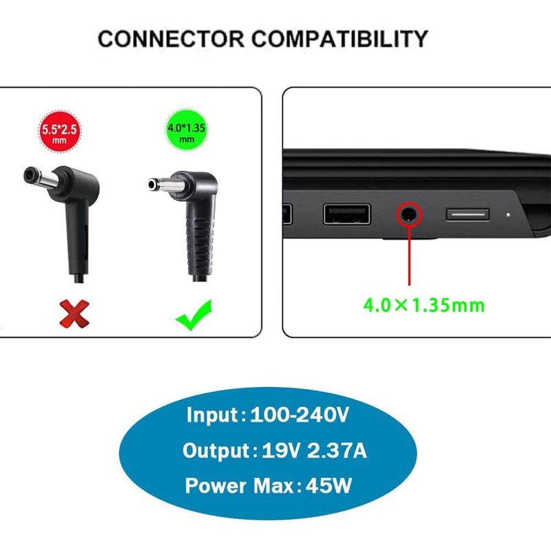 - Input: 100-240V, 50-60Hz; Output: 19V 2.37A 45W; ASUS charger interface size: 4.0*1.35mm; The total cable length of ASUS charger is 2.7m (portable)! Please check the voltage and voltage of the original adapter first. If you are not sure about the model, please contact us!