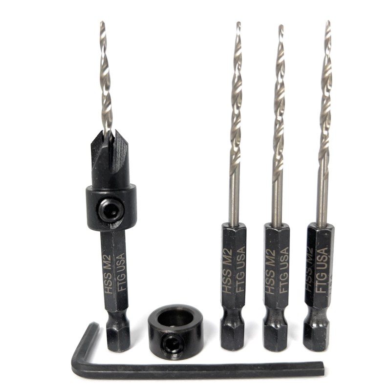 - Complete Countersink Drill Bit Set: #4 (7/64") countersink drill bit made to drill, countersink, and counter-bore in 1 step; 3 replacement tapered drill bits 7/64" for wood, 1 hex key and 1 piece 3/8" adjustable depth stop collar included