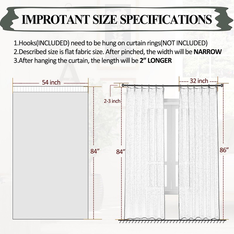 • 【Package Includes】: Each package of our sheer white curtains contains 2 curtains panels, each measuring 84 inches long and 54 inches wide, 2 tie-back, and 30 white metal hooks (hooks need to be hung on curtain rings, CURTAIN RINGS ARE NOT INCLUDED).