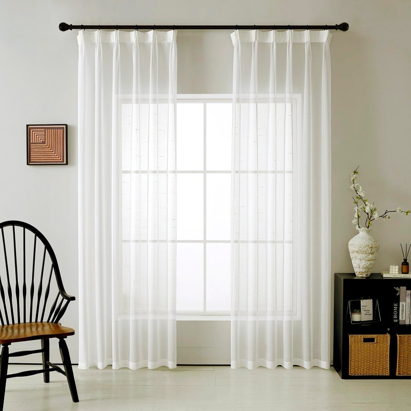 ●Each package of the white sheer curtain includes 2 curtains panels, 2 tie-backs and 30 white metal pleater tape hooks. The Fabric Width is 54 inches, When Pleated, the width is around 38 inches (maximum). And the sheer white curtains are very easy to remove and clean.