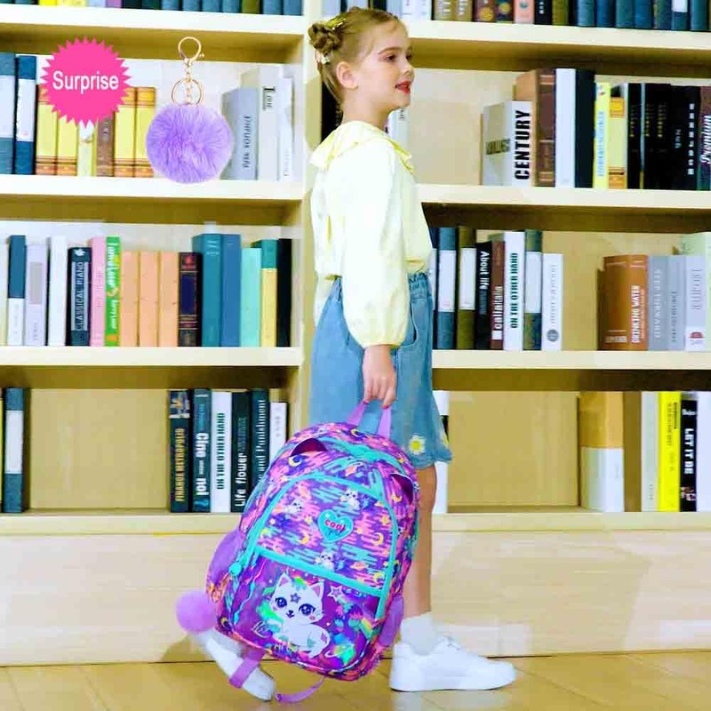- 3-In-1 Girls Backpack Set: Contain a cat backpack for girls (16.5"x 12"x 6" In),a laser lunch box (9"x 9"x 3" In),a pencil bag, and a furry pom as a surprise gift. Meet your kid's daily needs.