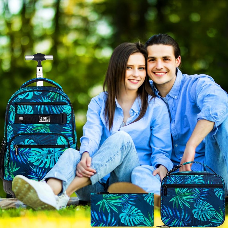 FTJCF 3pcs Rolling Backpack for Men, 21 Inche Adult Bag with Roller Wheels, Wheeled Bookbag Set for Boys - Green