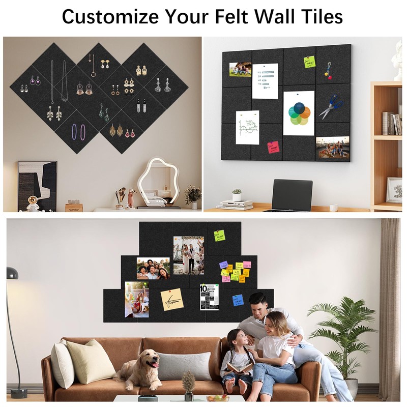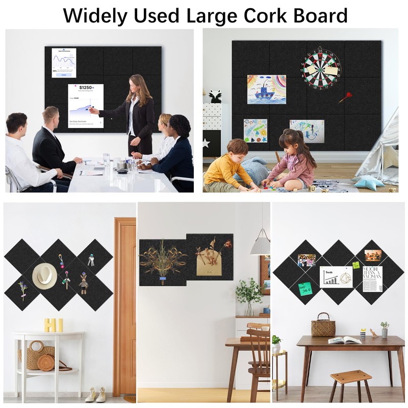 Customizable Size: Each cork panel measures 11.8" x 11.8" and 0.35" thickness, allowing you to easily create a bulletin board in various sizes, such as 36" x 24", 48" x 36", or 96" x 48". Mix and match themed classroom displays or showcase family memories at home. Premium Safe Material: Made from high-quality polyester fiber materials, our cork boards are durable, lightweight, and safe. They are also odor-free, hypoallergenic, eco-friendly, and recyclable, ensuring a safe environment. Superior Sound Insulation: High-density felt cork board tiles effectively absorb sound to reduce echoes and noise. Whether in home, office, or music studio, these panels help you enjoy a clearer and richer sound. Versatile Application – Our black cork board is ideal for displaying photos, notes, and reminders, these panels add style and function to offices, kitchens, or living for decoration or wall protection in various occasions.Easy Installation & Removal: Stick the panels in place using the included hook-and-loop adhesive. Secure items with pushpins on the corkboard. When it’s time to remove them, a hot hair dryer will loosen the adhesive without damaging your walls.