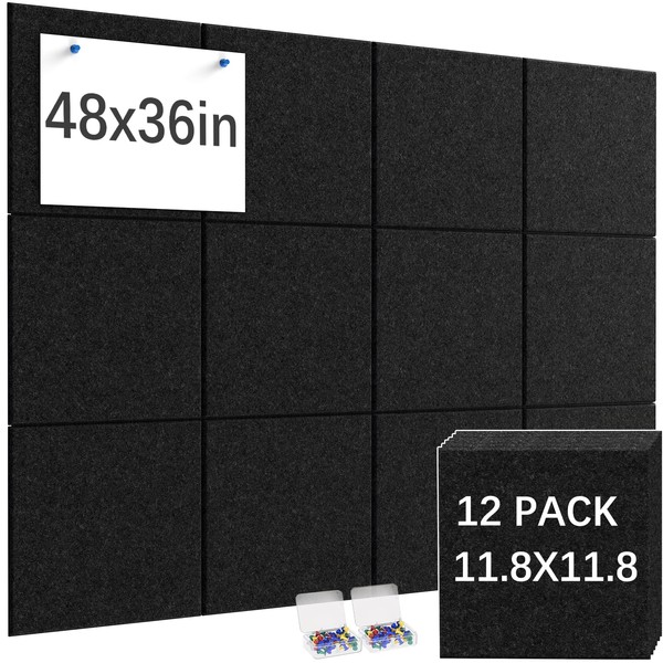 Ftumertly Large Cork Boards for Walls 12 Pack, Black Bulletin Board 48" x 36" Felt Wall Tiles, Cork Board with PushPins, Pin Boards with Safe Removable Adhesive, Tack Board Notice Boards for Ofiice