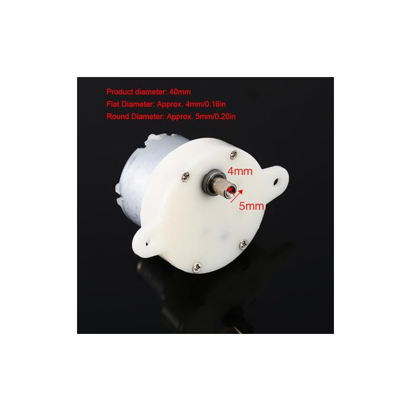 - Product diameter: 40 mm. Flat diameter: approx. 4mm/0.16"; Round Diameter: Approx. 5 mm / 0.20 inches. Geared motors can be found in many different applications and are probably used in many devices in your home.