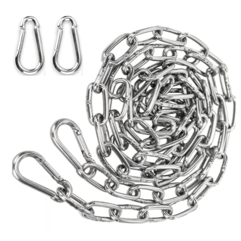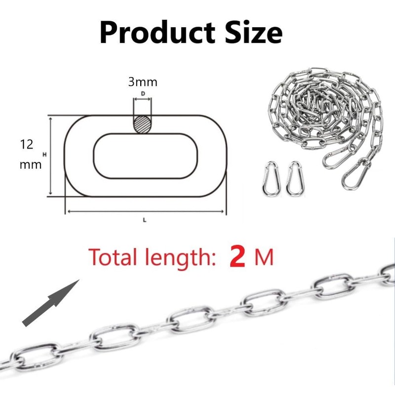 - PACKAGE INCLUDES: Includes a 2m 3mm thick steel chain with 2 x 4x40mm carabiners. Stainless steel chain with high-quality welding technology to prevent breakage, good workmanship, safe and solid.