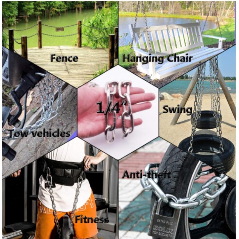 - Function: iron chain is widely used as swing chain, clothesline, pet chain, anti-theft chain, ground anchor chain, snow chain, lifting chain, guardrail and so on. The chain is suitable for garden, outdoor, woodworking, DIY and so on. Note: The chain is not suitable for climbing!