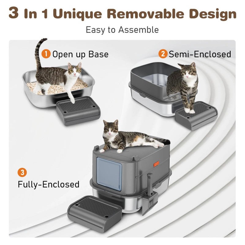 【Three Adjustable Heights Design】This litter box features a three-part detachable design, with both enclosed and semi-enclosed systems to meet the different needs of cats with various personalities. The snap-installation design aims to securely fix the shell and stainless steel litter box, it can be used freely in three different litter box heights, preventing urine leakage and litter splashing outside.
