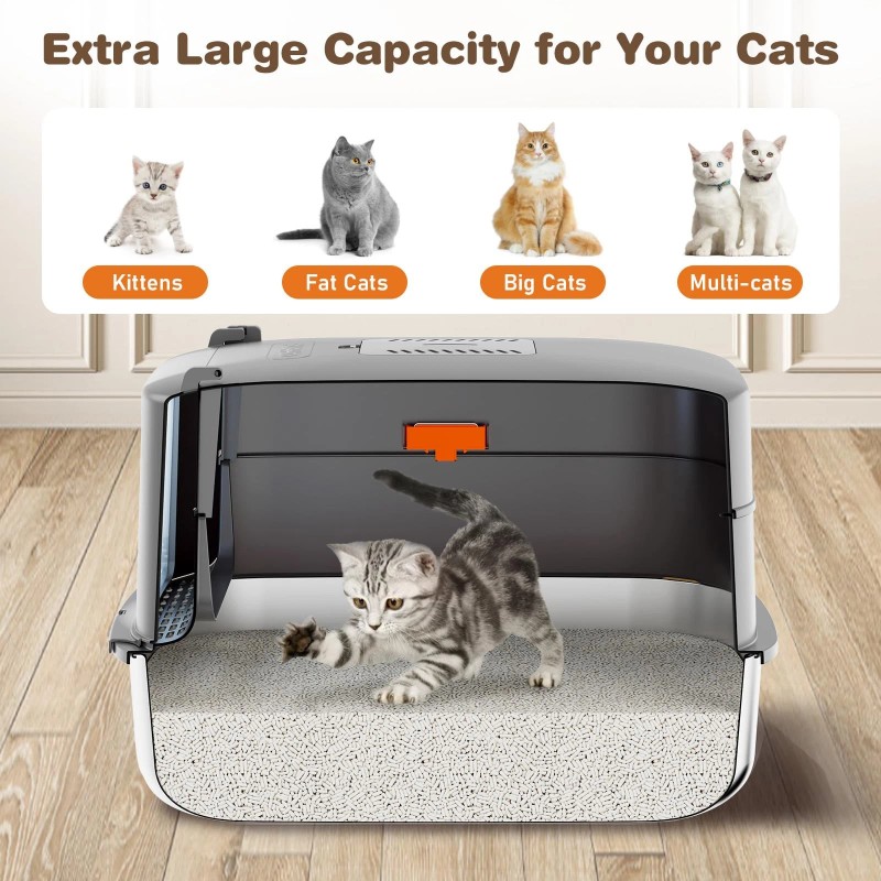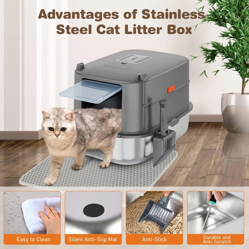 【Superior ABS and Stainless Steel Material】Ppgraded cat litter box made of High quality stainless steel, which is non-stick and easy cleaning by simply wiping litter pan, the ABS removable top lid is sturdy and durable with service life 10 years, perfect choice for long term use.