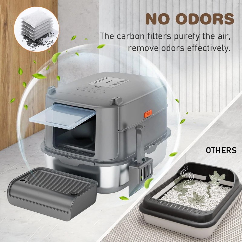 【Easy to Clean and Odor Free】FUEIRYOG stainless steel cat litter box features an easy-to-assemble, detachable lid that offers both fully enclosed and semi-enclosed configurations. The enclosed setup prevents odor from spreading, and provides privacy for your cat. Compared to other material litter boxes, the stainless steel litter box will not absorb any odors. It also has a deodorizing box on the top of the lid, you can replace it with an activated carbon filter to soak up and reduce odors.