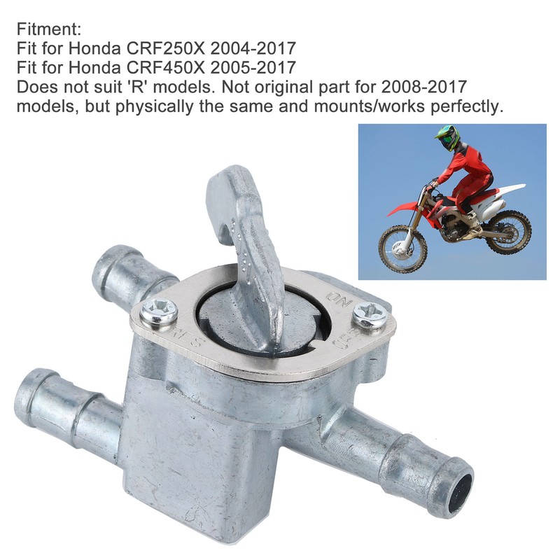 1、A valve to control the fuel circuit, function as the switch of the gasoline pipeline. 2、Great replacement or repair of damaged and worn fuel valves, brings better fuel performance for your engine. 3、Precise manufacturing technology, simple installation, no complicated tools required. 4、High‑quality steel alloy processing for long‑lasting durability, oil and corrosion resistance. 5、Practical protection accessory fit for Honda CRF250X 2004‑2017, fit for Honda CRF450X 2005-2017.