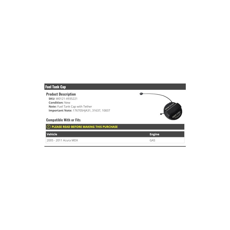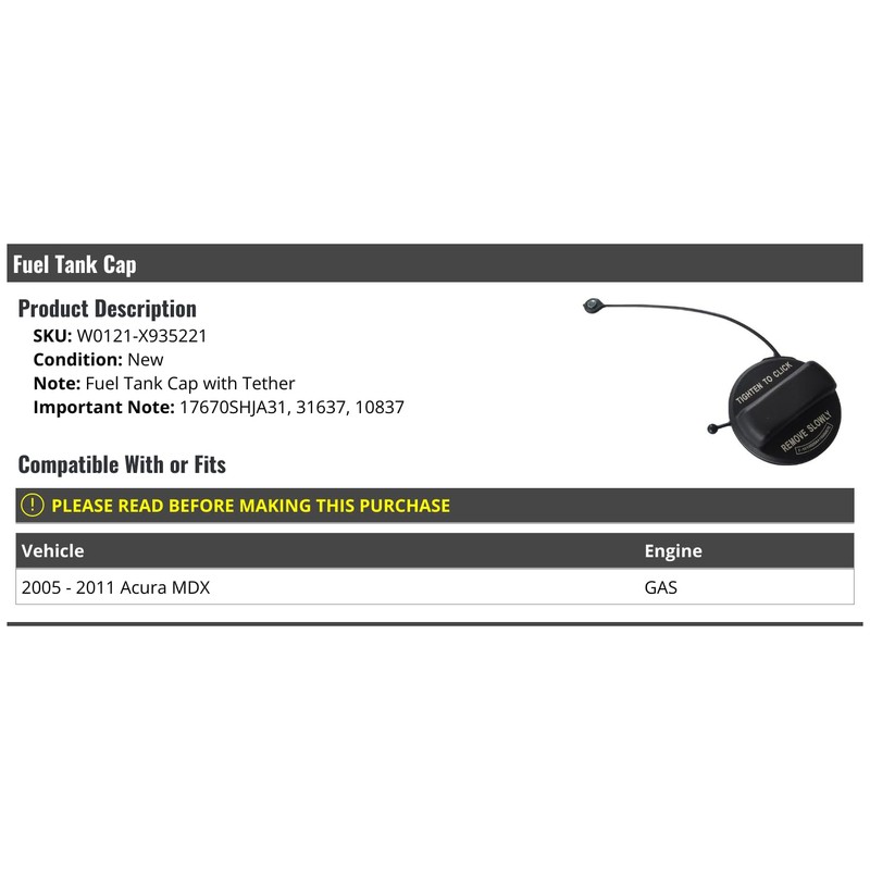 Fuel Tank Gas Cap with Tether - Compatible with 2005-2011 Acura MDX Gas