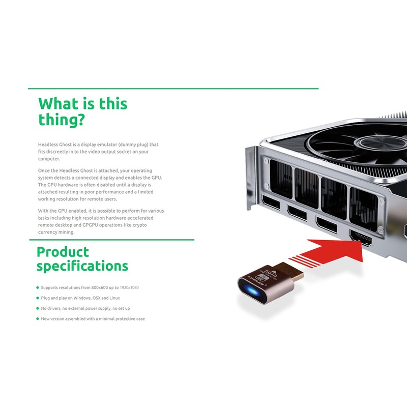 Headless Ghost is a display emulator (dummy plug) that fits discreetly in to the video output socket on your computer.Once the Headless Ghost is attached, your operating system detects a connected display and enables the GPU. The GPU hardware is often disabled until a display is attached resulting in poor performance and a limited working resolution for remote users.With the GPU enabled, it is possible to perform for various tasks including high resolution hardware accelerated remote desktop and GPGPU operations like crypto currency mining.
