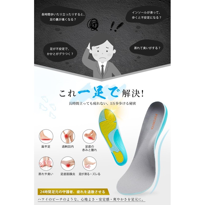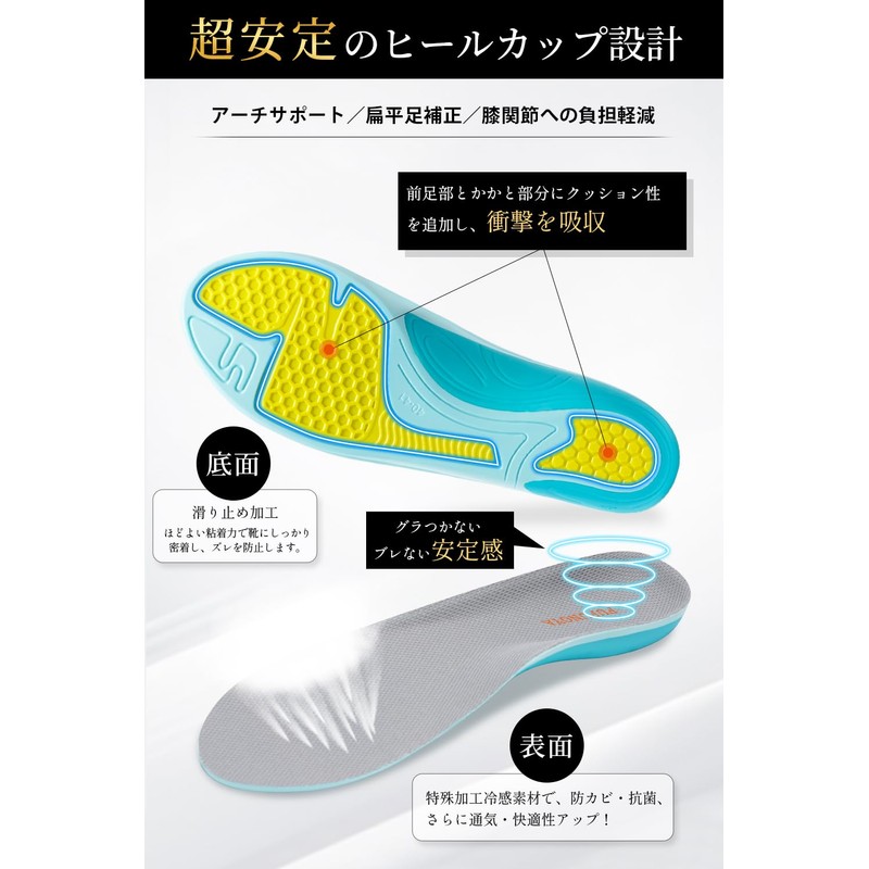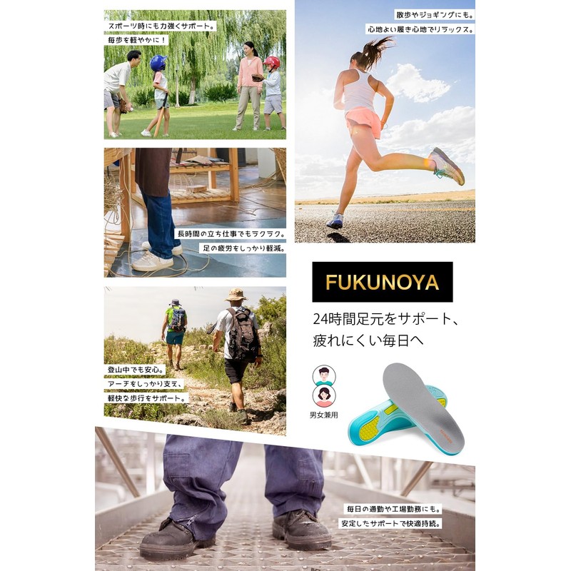 - (Arch Support x Shock Absorption) FUFUFUNOYA insole is equipped with U-shaped support that firmly supports the arch of the foot. The combination of high shock absorption material and antibacterial cool feel material balance the pressure of the sole of the foot for a comfortable fit