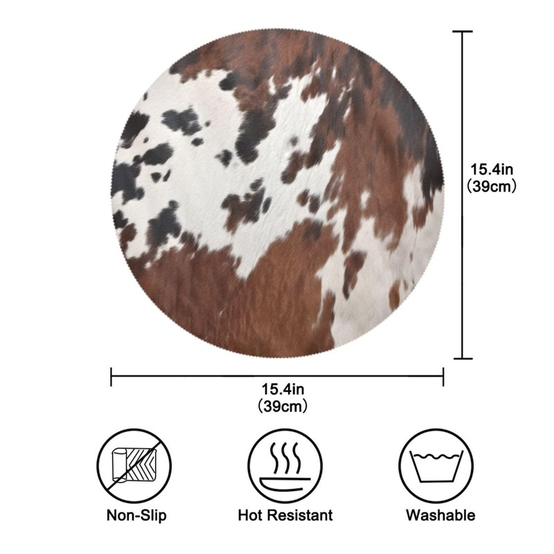 - Material - The round cowhide placemats are made of high-quality Polyester, Thin, wear-resistant, non-slip and anti-wrinkle, heat-resistant, durable, foldable, not easy to break, great for indoor and outdoor use